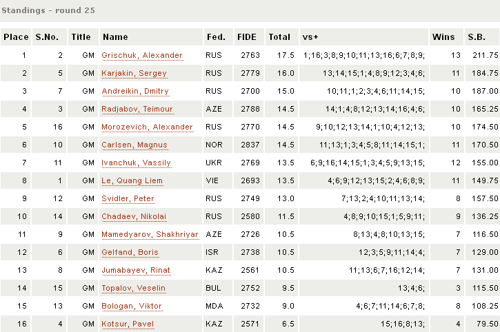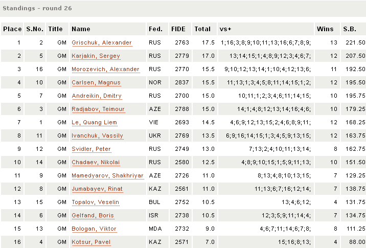 В 24 туре Грищук чёрными разгромил Мамедьярова,Карякин обыграл Гельфанда
