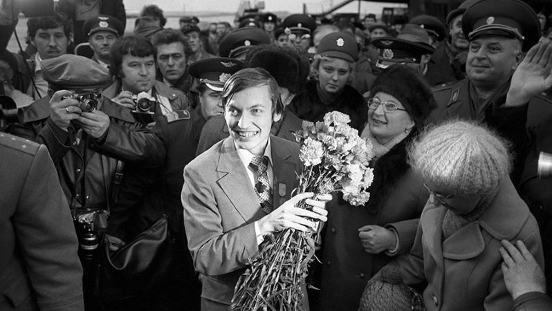 В этот день в 1978 году Анатолия Карпова встречают по возвращении в Москву после успешной защиты титула чемпиона мира против Виктора Корчного в эпическом матче в Багио-Сити.