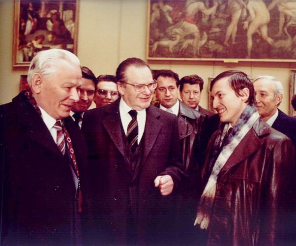 На фото: Анатолий Карпов и Андрей Чесноков за просмотром альбома с марками