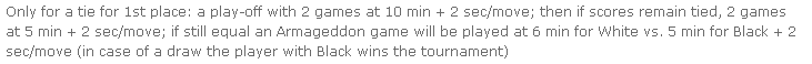 | В случае равенства очков при дележе 1-го места будет проведён тай-брейк: 2 партии в "быстрые" 10+2, потом (в случае равенства очков) 2 партии в блиц (5+2) и (в случае равенства очков) армагеддон (6+2-5+2). |