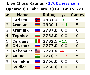 Улыбаясь, вспомнил недавнее (4,5 месяца назад) обсуждение другого очень короткого супертурнира - Sinquefield Cup, там правда участники провели по шесть партий. Общее то, что и там в итоговой таблице отрыв Карлсена составлял целое очко (перформанс 2966), что действительно много: