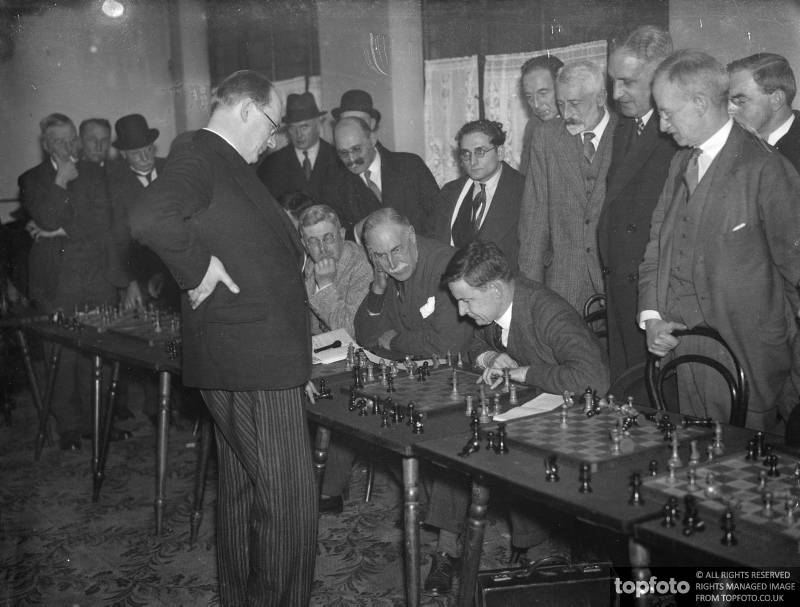 Доктор Алехин, чемпион мира по шахматам, сыграл одновременно с двадцатью пятью соперниками на турнире, проходившем в Шахматном клубе Империи в Бейсвотере, Лондон.