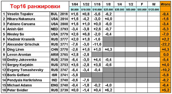 С точки зрения ситуации в Топ-10 рейтинга лишь Хикару пытается что-то, и, разумеется весьма здорово, ”изобразить”. А вот почти все остальные ”штурмовики высот” - Веселин, Виши, Фабиано и др. - как то на удивление дружно начали выпадать в осадок), выходя на заранее подготовленные позиции на рубеже 2800. Ощущение, что ещё пара турниров, и картинка станет походить на прошлую осень после Сент-Луиса 2014, причем в роли догоняющего (Фабиано) начнёт теперь выступать Хикару, а у целой группы других конкурентов Магнуса было тогда (условно) - что-то вроде 2799. |
