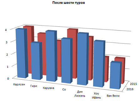 В шестом туре Вейка-2015 и Дин Лижэнь, и Каруана проиграли свои партии (Каруана вторую подряд), так что сейчас оба превышают прошлогодний график.