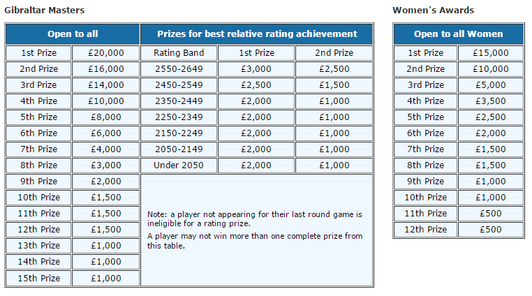 If there are two or four players tied for first place, there will be a speed knock-out play-off for the first prize of £20,000. If three players tie for first place, the player with the highest performance rating will be seeded directly into the Final of the Play-Off; the other two players will contest the Semi-Final.