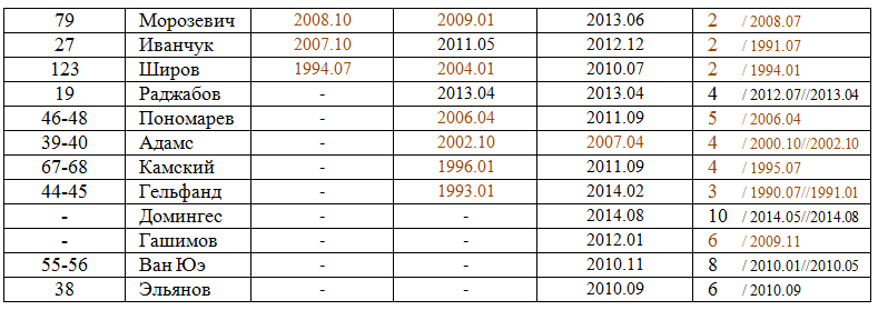 Здесь, в верхней части таблицы, вообще многое изменилось (кроме строк Накамуры, Топалова и Харикришны): состав "десятки" менялся в течение года, а на 2-м месте за год успели перебывать пятеро (!)