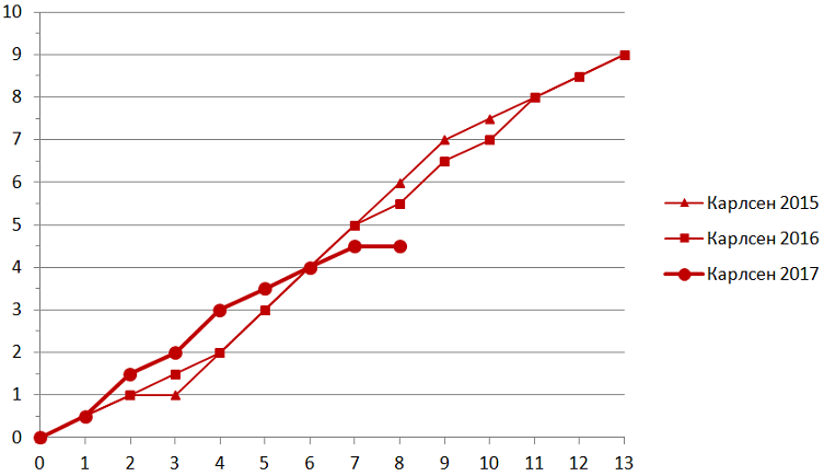 9,5 Карлсен всяко наберет. В ближайших четырех турах только Харикришна что-то сумеет противопоставить Карлсену. Начнется этот спурт завтра партией с Раппортом ходами g3 - g5. |