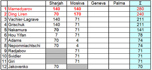 Мамедьяров и Дин за 2 этапа набрали по +4, причём китаец выиграл 1 турнир единолично, но очков больше у Шаха. Несправедливо! |
