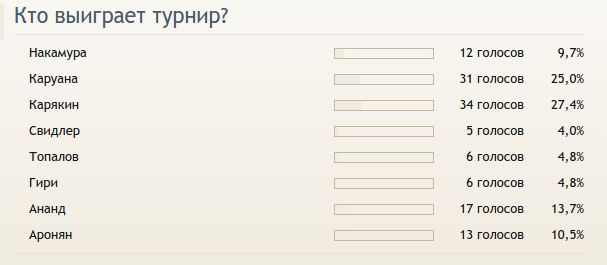 1. Каруана 2-3. Карякин, Накамура, 4. Гири 5-6. Ананд, Аронян 7-8. Свидлер, Топалов. Поскольку большого отрыва Каруаны с моей точки зрения не было, то, соответственно, я мог бы назвать Карякина одним из фаворитов.