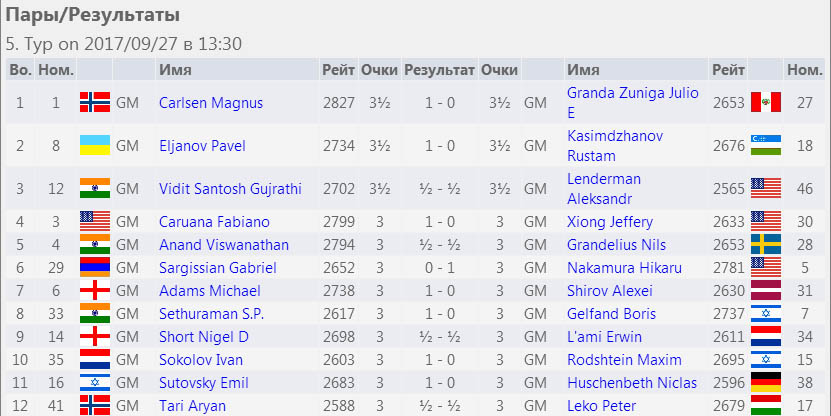 Сдал парень экзамен на отлично - чёрными выиграл, и теперь только на пол-очка отстает от лидирующего дуэта, вместе с Каруаной, Сутовским, Видитом, Лендерманом, Раппортом, Соколовым мудрым Фрессине, вероятно, Накамурой и... добившим Гельфанда Сетураманом. |