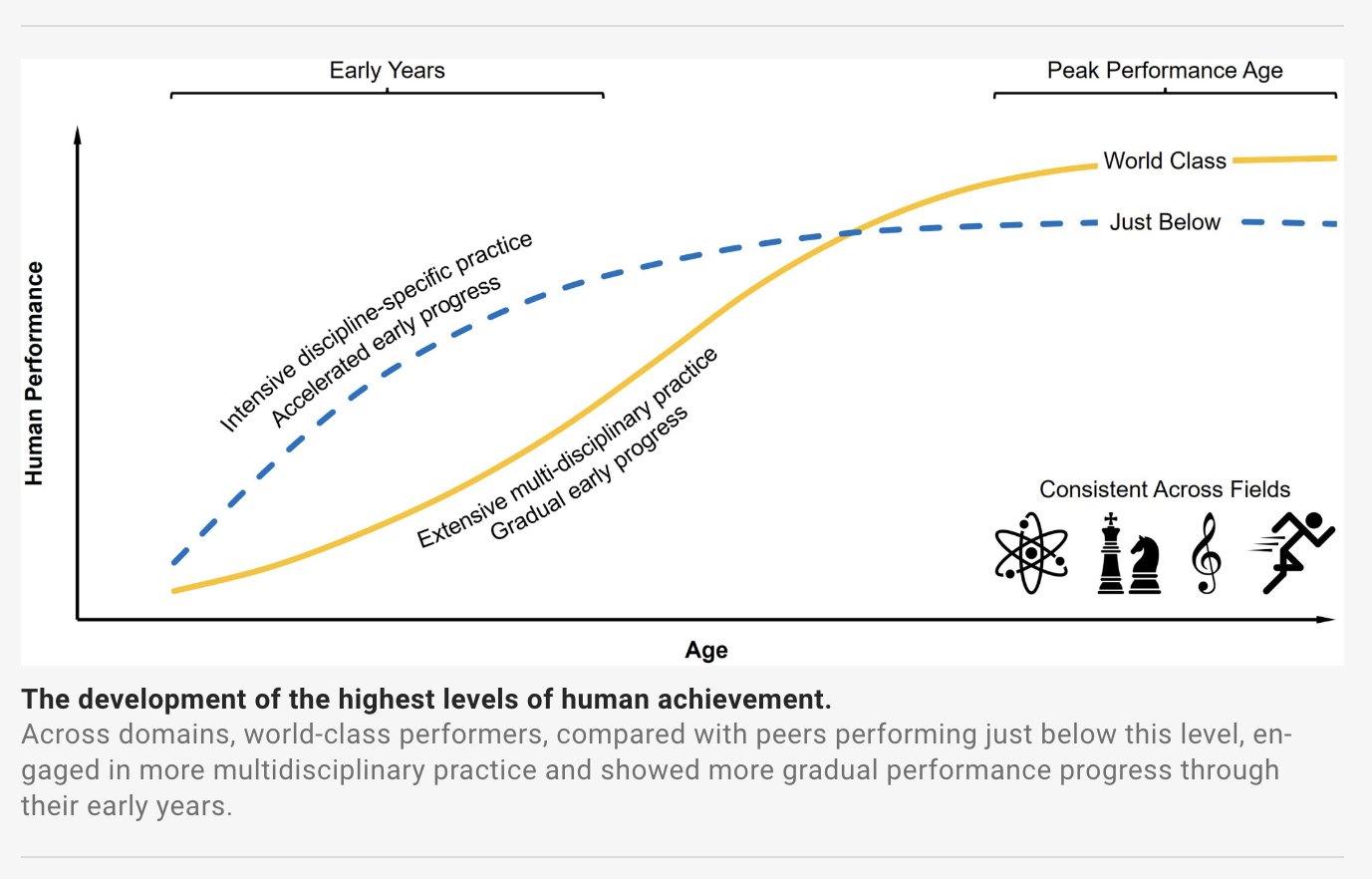| Масштабное новое исследование пиковых достижений охватило 34 000 ведущих профессионалов мирового уровня: нобелевских лауреатов, выдающихся композиторов классической музыки, олимпийских чемпионов и лучших шахматистов мира. Оно показывает, что ранняя специализация — это ловушка, а путь к величию долог и разнообразен. |