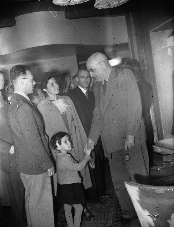 Mikhail Botvinnik is pictured with his wife, Gayane Davidovna, and their daughter Olya (b. 1942). The man they are talking to is, I believe, Ossip Bernstein.