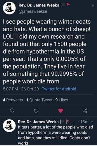 Но теперь-то мы знаем, что тепло одеваться следует заставлять принудительно, а тех, кто этого не делает, штрафовать и сажать. В гуманном мире, где ценят человеческие жизни - только так. |