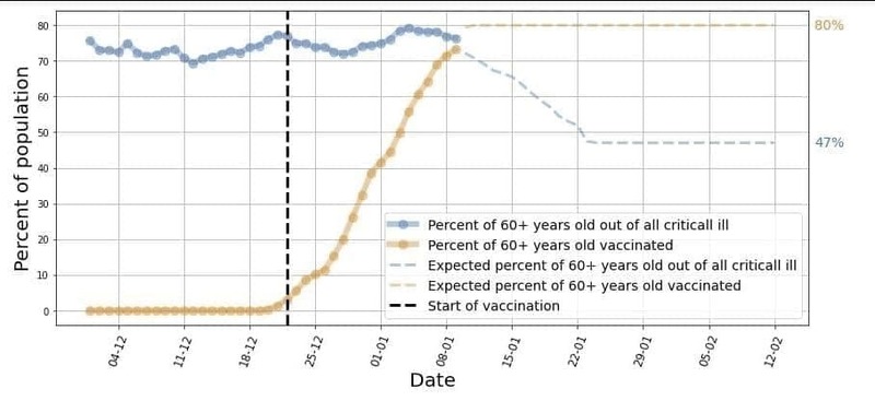 This week we expect to see the effect of the vaccines, by a drop in the relative number of 60+ years old out of the critically ill patients. Our projection is the blue dashed line