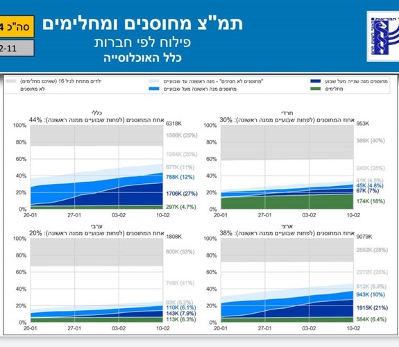 Минздрав публикует данные в том числе по секторам. В ультрарелигиозном секторе остались непривитыми 25%, в светском - 21%. Чтоб меня не пытались обвинить в манипуляции цифрами, объясняю - многие переболели, ещё больше просто не подлежит вакцинации в силу возраста.