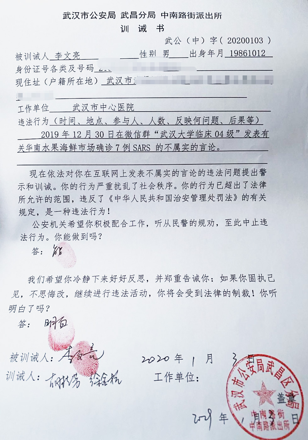 This document issued by the police in Wuhan on January 3, 2020, orders a doctor, Li Wenliang, to stop “posting false and untrue statements” about an infectious disease outbreak. |