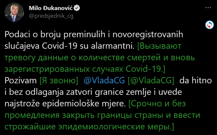 В Черногории сегодня за день умерло 20 человек — наибольшее число за все время.