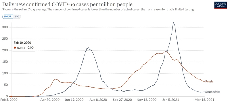Длинная статья, где авторы сравнивают три страны с очень разным уровнем вакцинации (в ЮАР почти никто не привит), но почти одновременно введенным локдауном, и приходят к выводу, что вакцинация может практически не тормозить распространения инфекции. Обрушение числа инфицированных может объясняться почти исключительно одним локдауном.