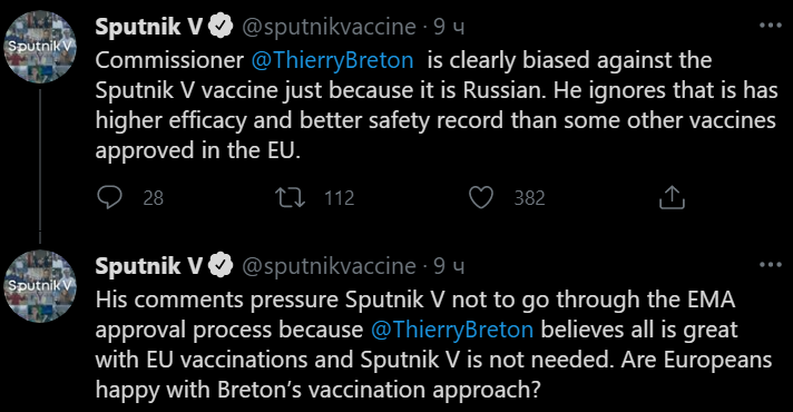 onedrey: | "С марта по июнь мы поставим от 300 до 350 млн доз вакцин в Европу. Поскольку Европа - континент, на котором больше всего вакцин (четыре), которые одобрены медицинскими регуляторами, - мы первый континент в плане производства вакцин. Нам абсолютно не нужен "Спутник V". Что касается "Спутника V", у россиян проблемы с его производством, и если им понадобится помощь, то мы вернемся к этому во втором полугодии, но сейчас приоритет отдан европейцам", — заявил еврокомиссар по вопросам внутреннего рынка Тьерри Бретон. |