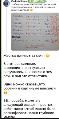 Вообще если, вся эта санта-барбара уже 242 страницы длится, уже кажется перестал удивляться, уже кажется, ничто не удивит. Привык. То, что один игрок с базой в 20 партий за 5 лет равно "Что доказывает статистика ОТБ" - ни разу не удивлен. Но тут все же две вещи удивили: