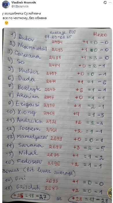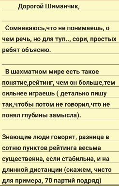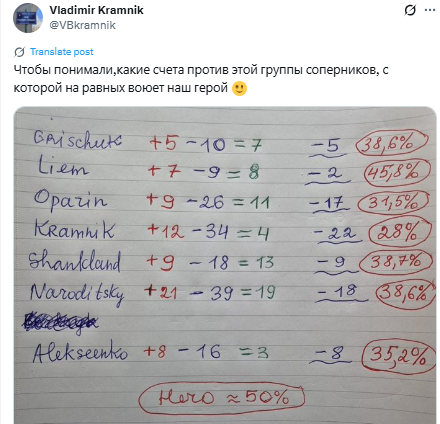 Впрчем, я понял, что это про игрока с похожим рейтингом, но не понял, зачем надо было "ткнуть пальцем в рейтинг-лист" - когда два десятка партий в игре за доской с семисотниками за пять лет наберется и у самого Шиманова. Два ЧМ по блицу (2022 и 2023) - уже пятнадцать партий.