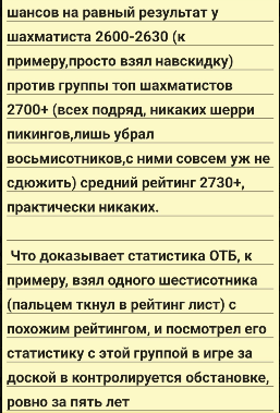То есть, у очень сильного шахматиста наблюдаются явные недостатки в игре блиц. Да, они в заключительных отрезках партии, и поэтому их труднее использовать соперникам. Но у любого игрока ("условный Гальченко") всегда будут относительно неплохие шансы эти слабые места использовать. если эти игроки дотянут до "осложнений"..