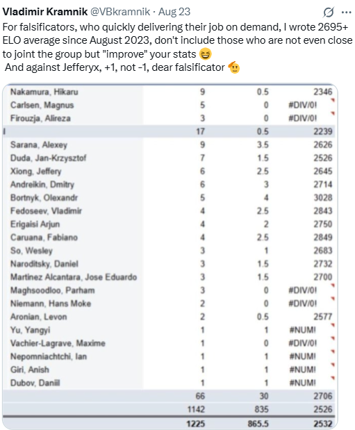 Вслед за "желтыми страничками" о Шиманове, последовал твит с табличкой, очень похожей на поименную расшифровку тех самых результатов Шиманова с семисотниками (включая троих неприкасаемых). Общее число партий, правда, не сопадало (в частности, и с восьмисотниками), но больше смутило меня другое. В тексте не было ни слова комментария к табличке, а сам твит был обращен к конкретному, но неизвестному, "фальсификатору". Или к неизвестным "фальсификаторам". Так что я поначалу саму табличку и принял за "фальсификацию".