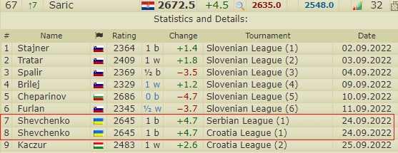 | Это, конечно, ошибка. В сербской лиге ни Шевченко, ни Шарич не играют (точнее, Шарич играет, но другой). Да и невозможно преодолеть 800 км от Пореча до Врнячки Бани так быстро, чтобы успеть сыграть две партии. |