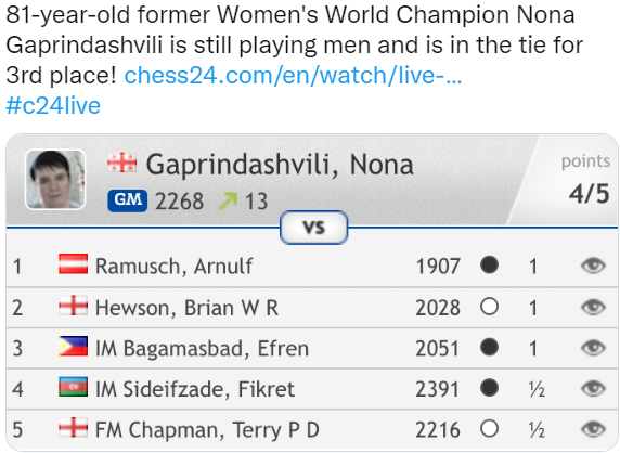А в турнире 50+ от России выступают: также WGM и экс-чемпионка мира Татьяна Богумил (МО) и сравнительно новый участник соревнований сеньор Елена Красенкова (Которая успела уже завоевать звание чемпионки России).
