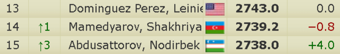 | Abdusattorov (2738.0 +4.0) beats Nguyen in Bundesliga to become World #15 |