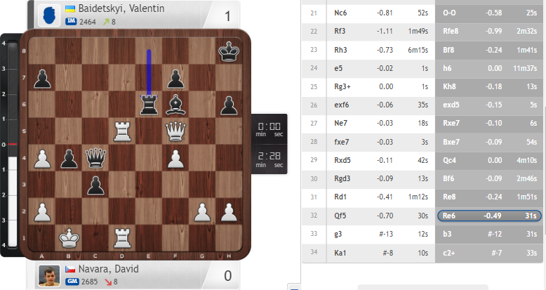 Вчера в чешской Экстралиге партия Навара-Байдецкий (украинский мм) протекала очень остро. Но здесь (в обоюдном цейтноте) Давид сыграл "не остро" 33.g3 - и все закончилось мгновенно.