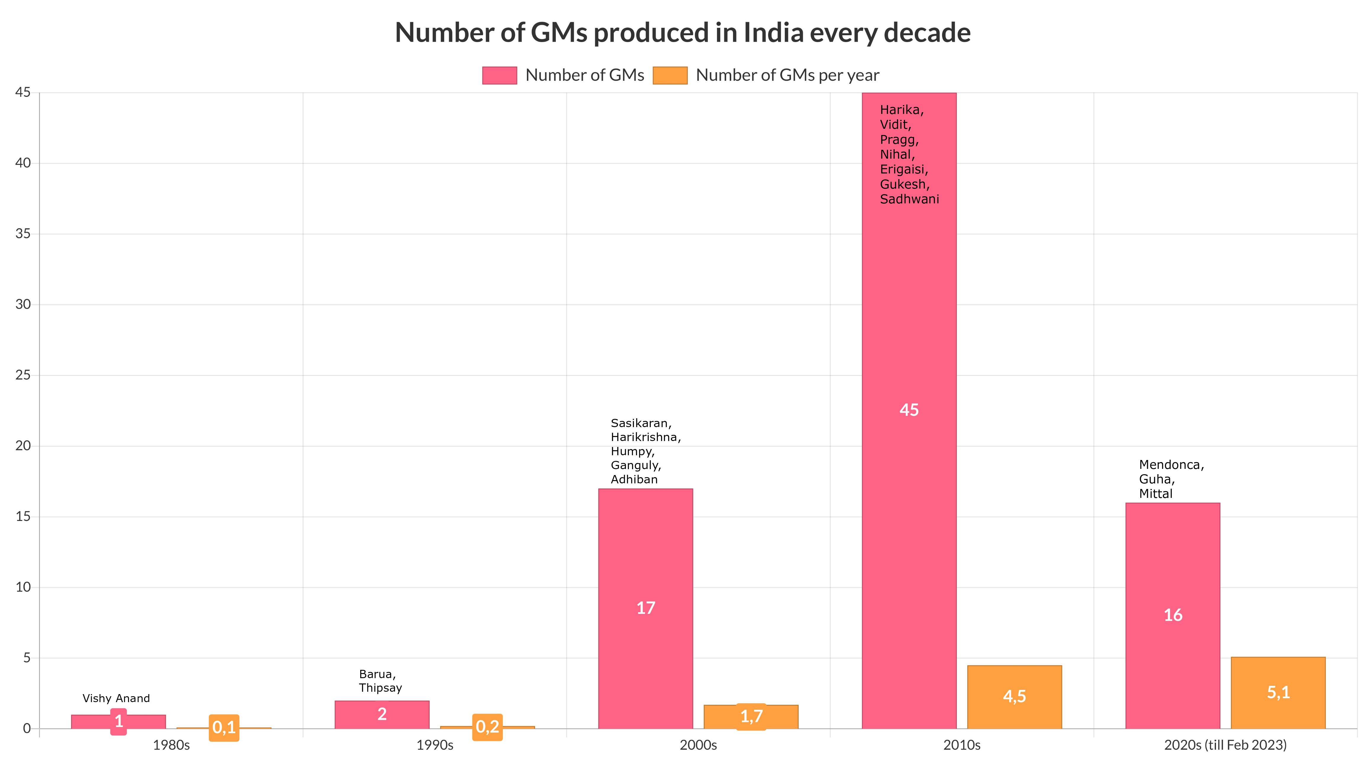 | As India celebrates its 81st GM (Sayantan Das) today, with already 4 new GMs since Jan 2023, i was intrigued to see the rate at which it was producing GMs lately. So i decided to make a graph. The graph is pretty much self explanatory. For every decade i wrote some notable GMs. Chess boom is real. |