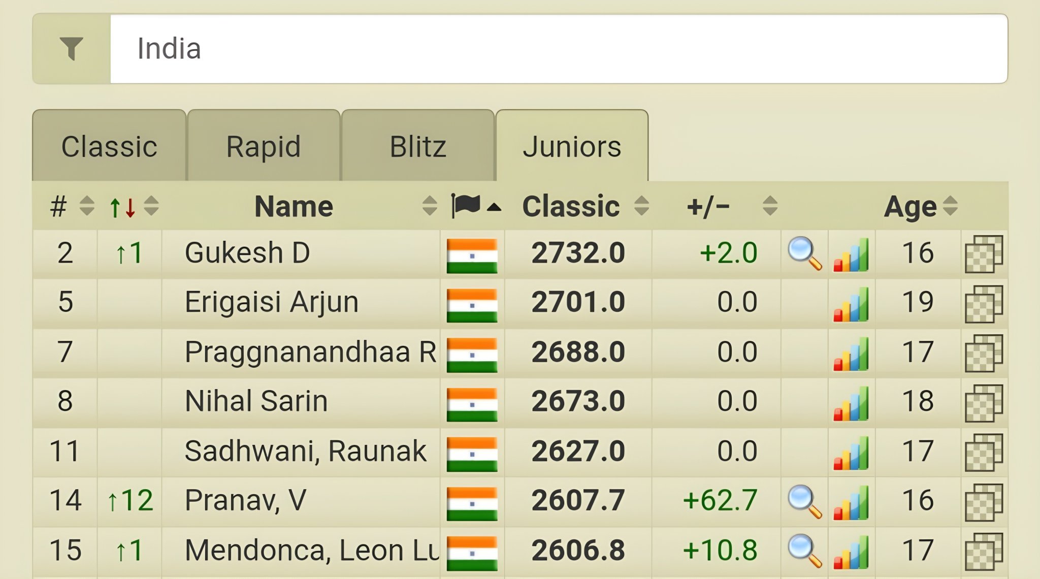 | 7 Indian Juniors now in Top #15 juniors worldwide, All above 2600+ elo. |