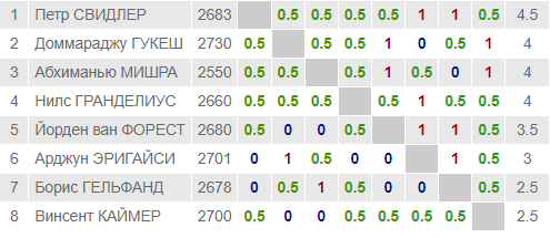 Итоги. 1. Свидлер - 4.5; 2-4. Гукеш, Мишра, Гранделиус - по 4; 5. ван Форест - 3.5; 6. Эригайси - 3; 7-8. Гельфанд, Каймер - по 2.5