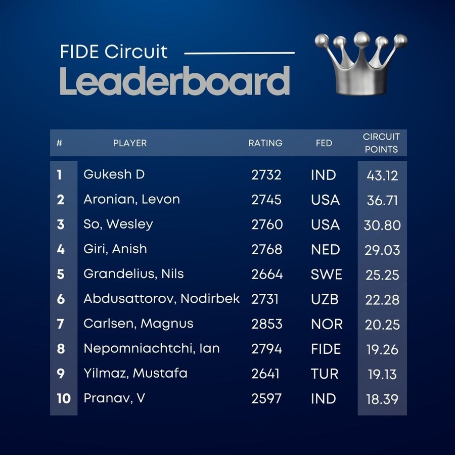 @DGukesh has three tournaments calculated for the Circuit so far: WR Chess Masters (2nd place, 19.26 Circuit Points), Menorca Open (1st place, 11.64), and TePe Sigeman & Co Chess Tournament 2023. By the end of the year, each player has to play in a minimum of five eligible tournaments. The final FIDE Circuit point score will be calculated as a sum of a player's five highest event scores. The one who gets the most points qualifies for the FIDE Candidates 2024! |