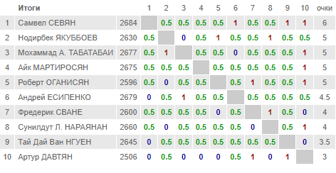 Итоги. 1. Севян - 6; 2-5. Якуббоев, Табатабаи, Мартиросян, Оганисян - по 5; 6. Есипенко - 4.5; 7-8. Сване, Нараянан - 4; 9. Нгуен - 3.5; 10. Давтян - 3