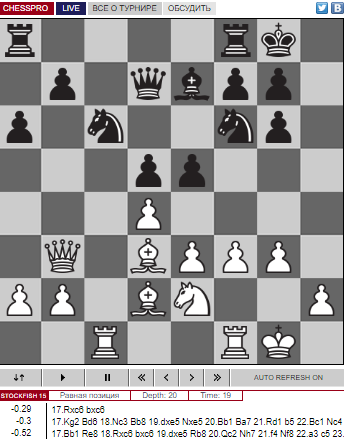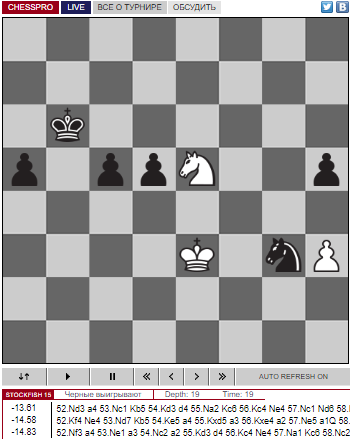 46 минут здесь потратили белые на расчёт 14.Сd2? но таки не учли один нюанс 14...Сd4! 15.Cc3 C:с3 16.С:d5?? Кd4! 0:1 |