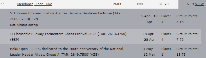 У индийца Мендонки (о чем я тоже писал) также два турнира в Испании. Но ни один из них у Мендонки не "отнят", оба по-прежнему идут ему в зачёт! Просто один из двух турниров неожиданно помечен как "национальный чемпионат". (Чемпионаты стран - если они илиджбл - идут "отдельной строкой", не считаются как "турнир в одной стране").