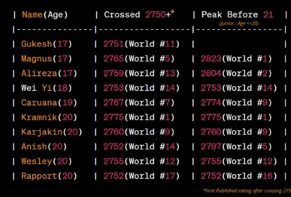 | Формально Гукеш становится рекордсменом: в листе от 1 августа 2023 он достигнет рубежа 2750 (и даже пересечет) в возрасте 17 лет 2 месяца, а Карлсен пересек 2750 1 апреля 2008 в возрасте 17 лет 4 месяца. Однако, если бы в 2008-м рейтинг-листы публиковались не раз в квартал, а ежемесячно, то после обсчета турнира в Вейке (закончившегося 27 января) Карлсен в листе от 1 февраля 2008 имел бы ровно 2750 в ровно те же 17 лет 2 месяца, что и Гукеш сейчас. |