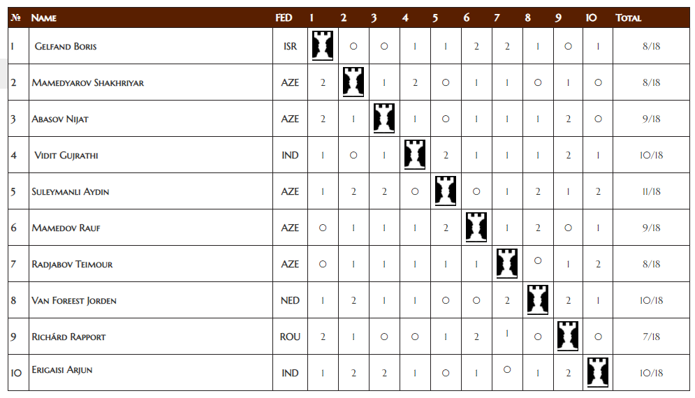 10 GM Abasov, Nijat 2561 AZE ½ 0 0 0 0 0 0 ½ ½ *** 1,5 |