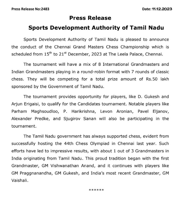| The official press release by the Sports Development Authority of Tamil Nadu for the Chennai Grand Masters 2023! |