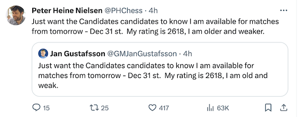 На мой взгляд, Леньер и Фируджа демонстративно показывают ущербность системы, которую придумала ФИДЕ. Но начали эксплуатацию уязвимости не они, а Гукеш с Эригайси. |