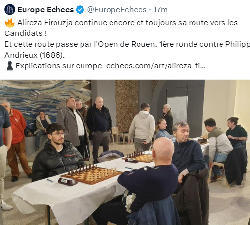 | Firouzja is still fighting for the Candidates spot — playing an Open in Rouen. This is a battle that could well end up in the Court of Arbitration for Sport in Lausanne! |