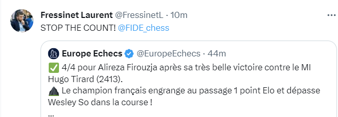 | Мне кажется, если не посчитают этот турнир, ФИДЕ может получить иск от Фируджи. Или от французской федерации. |