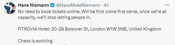 Hans Niemann Against the World continues to London with a match against England #1 Nikita Vitiugov. Starting with 3 days of classical, 14-16, games at 10am and 4pm at the Fitzrovia Hotel . Rapid and Blitz on the 17th and 18th will start at 6pm. Since I'm a man of the people, I've decided to make the tickets free, those who already bought them will be refunded. If you aren't in London, you can watch the live commentary.