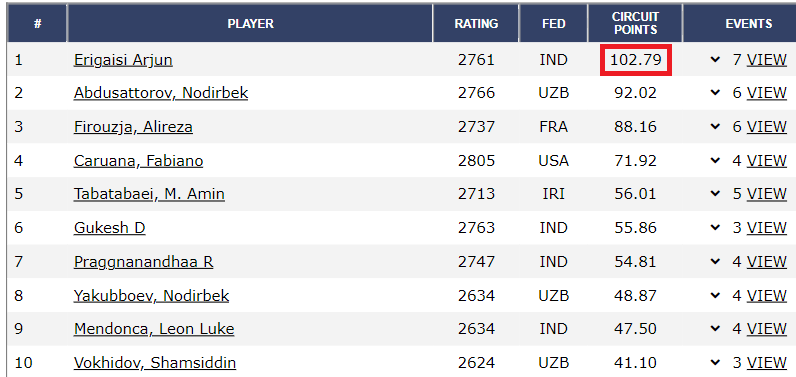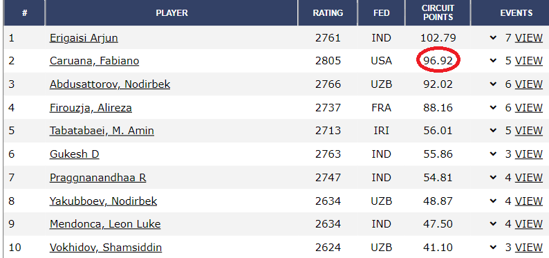 FIDE circuit standings after @FabianoCaruana's win at the #USChessChamps.