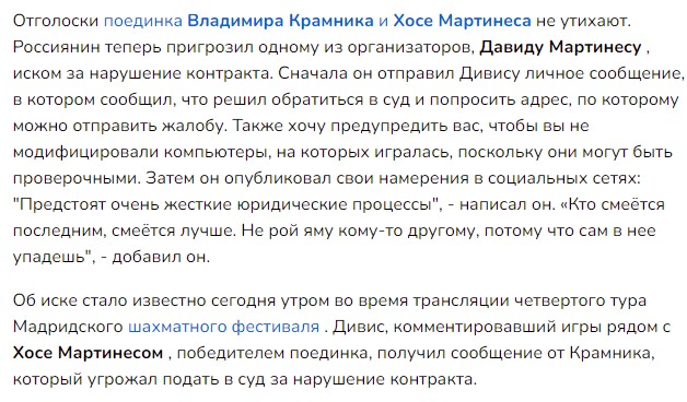 | Крамник реально считает, что чесском спецом устроил технические проблемы? Консультировался со специалистами, наверное. Тогда надо через суд обеспечить доказательства, арестовав и опечатав ноуты. |