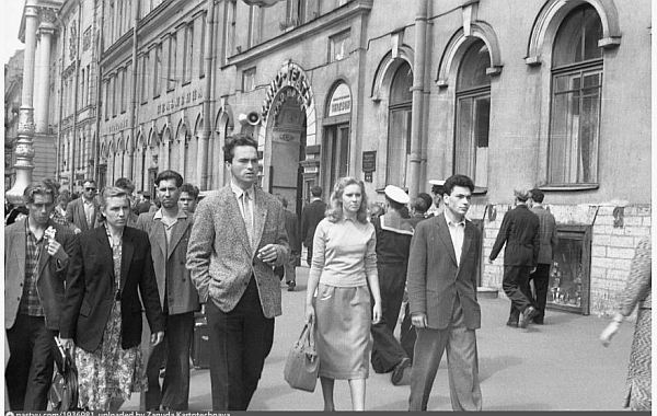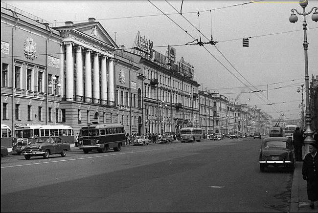 После войны на Невском в коммунальных квартирах жило много людей. Вечерами и по выходным на проспект стекался народ из соседних улиц, приезжали из других районов. По тротуарам ходили толпы, порой было трудно протолкнуться. В те годы магазинов в городе явно не хватало, и торговля была в основном сосредоточена на Невском. «Пассаж», «Гостиный двор», «Елисеевский» магазин, в который порой трудно было просто войти из-за большого скопления людей, «Дом книги». Около кинотеатра «Художественный» располагался на двух этажах большой военторг. Почти в каждом доме было несколько магазинов. В нашем доме (Невский, 88), например, была булочная, бакалейный магазин, две столовые, междугородний телефонный пункт. В булочной можно было выпить кофе с булочкой. |