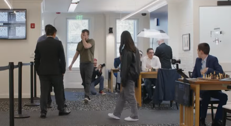 Да, спасибо, ребята. Да, действительно, я здесь с Фабиано, который только что выиграл партию против Григори. Поздравляю, Фаби!