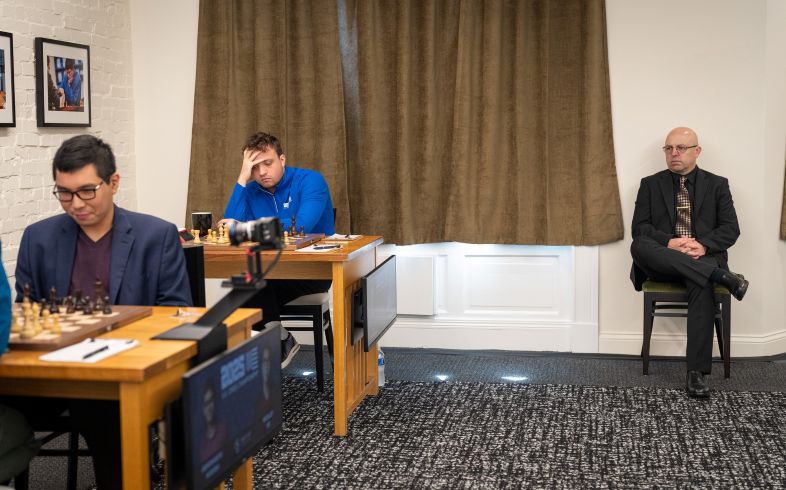 Спасибо, Кейт. Да, я сейчас с ещё одним лидером турнира — Уэсли Со, который только что выиграл партию у Сэма Шенкленда и вышел в единоличные лидеры с двумя с половиной очками из трёх.